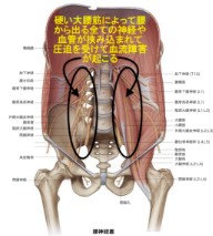 大腰筋は身体の前側で最深部に位置します。大腰筋が硬く短縮していると神経の圧迫だけでなく、腰が伸びにくいので、前屈みの姿勢が常態化して狭窄症などの脊柱の変形を助長させます。
